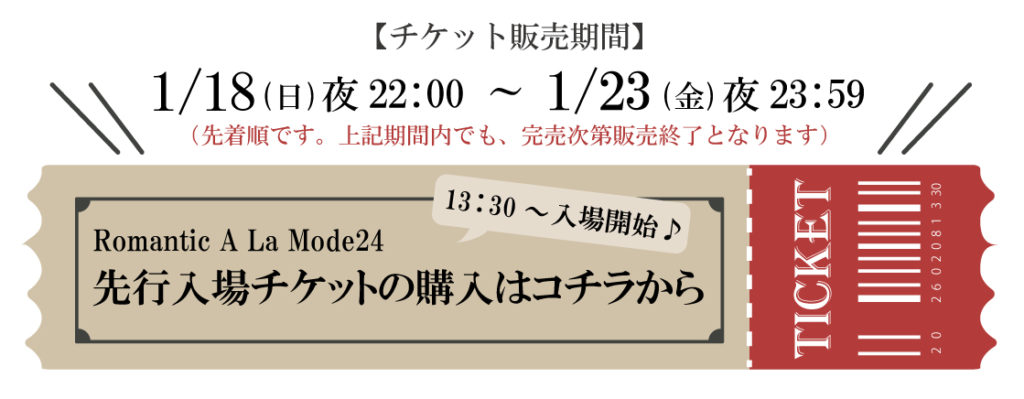 | 【入場チケット販売期間】 1/25(日)夜22:00~ 2/7(土)夕方17:00まで |